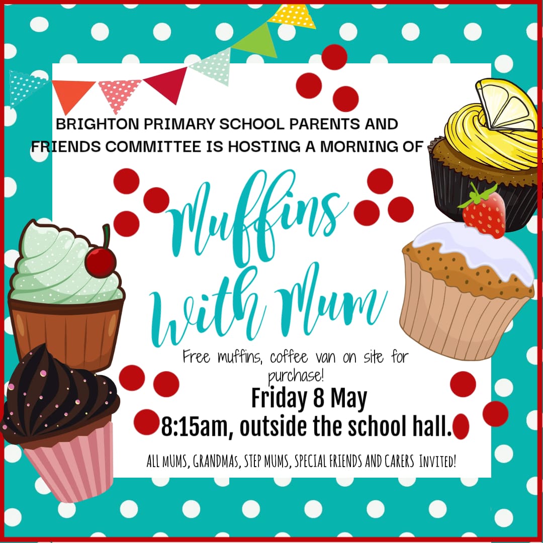 Muffins with Mum will be held on Friday the 8th of May, 8:15am outside the school hall.